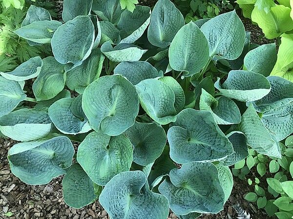 Crinkled Leather' adds a touch of rugged elegance to your garden. With its large, solid leaves in a mesmerizing shade of blue, this unique variety features twisted and wavy foliage, reminiscent of well-worn leather. As it matures, 'Crinkled Leather' reveals its puckered, crinkly leaves adding an extra layer of charm.(Mature Size: 33"Tx22"W)