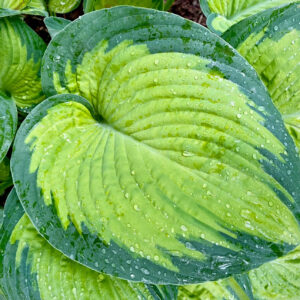 Hosta ‘Cat in the Hat’ is a striking variegated sport of ‘Fat Cat’, boasting large, broadly ovate leaves with light green centers and wide, intensely blue-green margins—it’s so grand, you’ll feel like the Cat himself could be hiding beneath its leaves!(Mature Size: 30″T x 44″W)