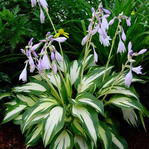 A medium hosta with lance shaped leaves decorated with wide white centers and green margins. A fairly quick grower. Lavender flowers in midsummer. A very festive hosta!(Mature Size: 14″T x 24″W)