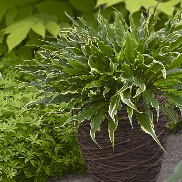 A very distinct small hosta which forms an upright mound of tightly rippled, twisted, long and narrow leaves. The slightly shiny green leaves display electrifying yellow margins which lighten to creamy yellow in summer. Mature plants will have red speckled petioles. Lavender flowers top the clump in midsummer. A good grower that would not only look sharp in a garden but also a low, round container.