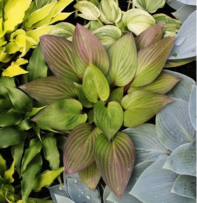 A small hosta from Bob Solberg with green leaves and red petioles whose red bleeds into the leaves and even lines the margin. You’ll find soft blushing in between the veins in spring too. Finally, the “red hosta” everyone has been waiting for! Pale purple flowers in late summer.