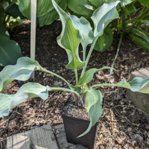 Frill Ride,’ a medium-sized Hosta that offers a whimsical journey with its long, wavy blue leaves and frosty white backs. Fast-growing and full of character, it features a uniform ripple from base to tip, adding unique charm to your garden. With its elegant, upright growth and mid-summer lavender flowers, ‘Frill Ride’ brings a delightful and distinctive touch to any garden.(Mature Size: 20″Tx30″W)