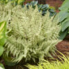 This Japanese Painted Fern has silvery fronts which fade into a purple towards the center. The purple-red veins also make this one of the most colorful ferns in the garden. This fern also has a low mounding habit so it grows densely.