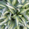 This giant hosta has wide heavily textured, shiny, and chartreuse leaves that will change to gold in brighter light. White flowers.(Mature Size: 36″T x 60″W)