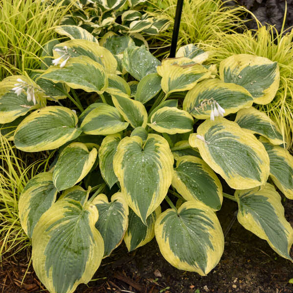 A beautiful blue hosta with a glowing margin. ‘Chance Encounter’ features heart-shaped, powdery blue leaves with a wide, uneven margin that emerges apple-green and brightens to gold. A rare ‘watermark’ often appears where the colors meet. (Mature Size: 15″T x 43″W)